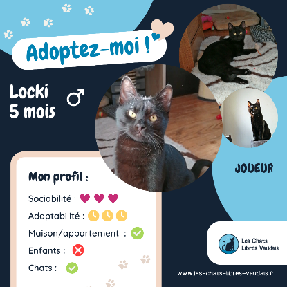 Locki est un chaton de 5 mois très bien dans ses patounes ! Locki adore jouer avec tout ce qu’il trouve : petite balle, plume, même les ombres sur le mur. Ce chaton déborde de vie, de curiosité et communique sa joie. C’est un chaton très gentil, et aussi gourmand. Il sait aussi très bien se faire comprendre quand il a envie de câlin !
