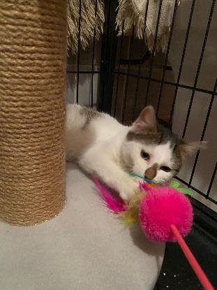 Durant mes premières semaines auprès de ma famille d’accueil, j’ai appris à me familiariser avec l’humain. Je suis encore un peu timide, j’ai besoin de temps pour accorder ma confiance. J’ai tout de même fait d’énorme progrès car depuis que ma sœur est partie , je me suis rapproché incroyablement de ma famille d’accueil. j’apprécie les caresses. Ce que j’aime par dessus tout c’est jouer !