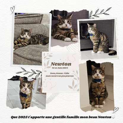 Newton est un chaton doux, joueur et câlin. Cependant, il est encore un peu peureux il aura besoin d'une famille douce et patiente.
