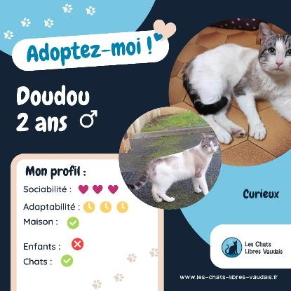 Doudou est un minet adulte extrêmement sociable et gentil. Il adore les humains, et c’est un vrai pot de colle à la maison ! Très curieux, Doudou suit son humaine partout. Il adore explorer, découvrir de nouvelles cachettes, jouer, et avoir le droit à des friandises. Doudou est tout jeune, il a beaucoup d’énergie et d’amour à offrir. C’est un chat formidable, qui mérite une très gentille famille.