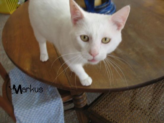 MARKUS, chat né le 10/04/2018 Couleur : blanc MARKUS a été trouvé errant, seul et récupéré par une bénévole pour être pris en charge par l'association. MARKUS est adorable, très joueur et hyper sociable avec les humains, mais ne s'entend pas avec ses congénères. Un accès extérieur sécurisé est fortement recommandé. MARKUS est primo-vacciné, identifié, testé FIV négatif et FELV négatif et stérilisé. Il est aussi vermifugé et déparasité. Frais d'adoption 180 € En Famille d'accueil à Chantonnay (85). Covoiturage possible dans le Val d'Oise. Si vous souhaitez l'adopter, contactez-nous au 06 17 40 10 22 de 9h à 20h, n'hésitez pas à laisser un message sur le répondeur (surtout PAS DE SMS, merci).