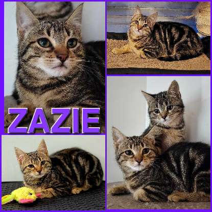 "Moi c'est Zazie, avec mon frère et mes sœurs nous sommes nés dehors en septembre et grâce à une campagne de stérilisation sur Baule, nous avons été mis à l'abri avec maman.