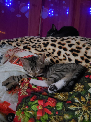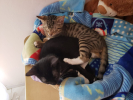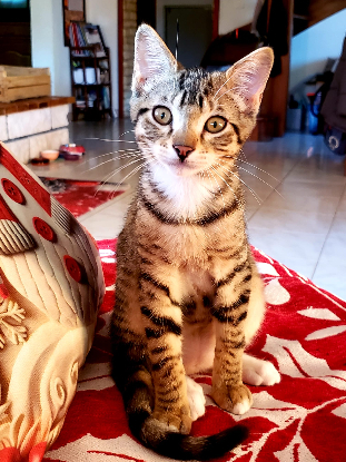 voici un petit chaton de 3 mois tigré avec des pantoufles blanches, il est proposé à l'adoption avec sa soeur Moana..