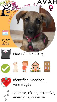Idéalement, Avah cherche une famille prête à s’investir dans son éducation pour lui permettre de devenir une chienne épanouie et équilibrée. Avec un zeste de patience et beaucoup d’amour, elle sera votre meilleure amie pour la vie ![]()