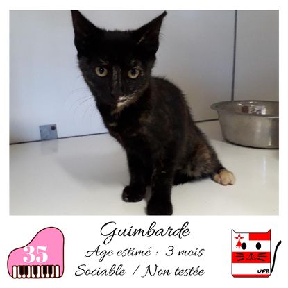 URGENCE EUTHANASIE ! Guimbarde est une femelle de 3 mois sociable qui vous attend dans une fourrière du 35. ATTENTION SORTIE AU PLUS TARD LE 7/08/2020 (avant euthanasie) ! Pour adopter, c'est facile : ➡️ On se rend sur la page facebook d'Urgence Fourrière de Bretagne (UFB) -> https://www.facebook.com/sosfourrieresbreizh/ ➡️ On vient en message privé sur la page UFB ➡️ On remplit le questionnaire ➡️ Si le questionnaire est validé, on se rend disponible pour la pré-visite ➡️ On se rend aussi disponible pour venir chercher le loulou en fourrière Les chats sortent de fourrière primo-vaccinés et identifiés. Restera à charge de l’adoptant le rappel de vaccin et la stérilisation qui est OBLIGATOIRE. Les femelles en fourrière ayant été trouvées dans la rue, il y a fort à parier que nombre d'entre elles en âge de l'être soient gestantes ... ---- A PROPOS D'URGENCE FOURRIERE DE BRETAGNE (UFB) Nous sommes un COLLECTIF d'ASSOCIATIONS DE PROTECTION ANIMALE (qui rassemble notamment Moustaches et Compagnie, Bêtes de Scène, les Pachas, Chats Libres de Berné, etc, etc....) Le BUT de ce collectif d'associations est donc de SORTIR ces animaux des fourrières surchargées en les faisant ADOPTER de manière LEGALE par des familles ou en leur trouvant des FAMILLES D'ACCUEIL lorsque des places en association se libèrent.