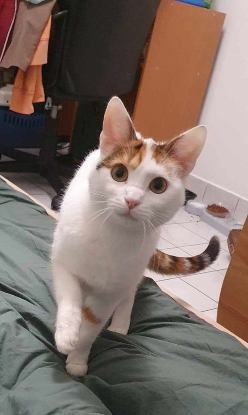 Petite chatonne blanche avec de petites taches rousses et noires et la queue tigrée. Adorable, un peu plus joueuse que Torti, un peu plus timide aussi. C'est une petite gourmande qui vient tout de suite quand on sort le paquet de friandise. Câline et très calme.