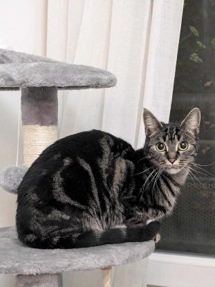 Chatonne rayée noire et grise petit modèle très sociable et câline. Elle est très curieuse et viens vous voir pour des câlins en ronronnant. Elle vient faire vous voir quand vous rentrez, est joueuse et adore fureter un peu partout.