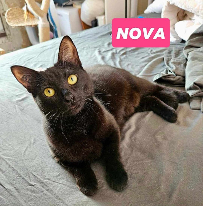 Nova est une jolie chatte noire qui a un poil particulièrement dense et doux. Sous ses aires de panthère noire inaccessible, Nova a l’âme d’un grand bébé qui adorera vous solliciter pour jouer avec elle. Elle aime particulièrement les jouets fourrés avec de l’herbe à chat qu’elle s’amusera à vous rapporter au pied pour que vous le lui lanciez et ainsi de suite jusqu’à épuisement (et c’est rarement elle qui s’épuise en premier). Elle adore aussi la canne à pêche qui fera ressortir son côté chaton foufou hyper craquant !