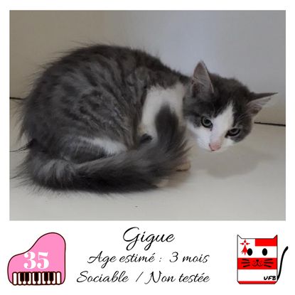 URGENCE EUTHANASIE ! Gigue est une femelle de 3 mois sociable qui vous attend dans une fourrière du 35. ATTENTION SORTIE AU PLUS TARD LE 7/08/2020 (avant euthanasie) ! Pour adopter, c'est facile : ➡️ On se rend sur la page facebook d'Urgence Fourrière de Bretagne (UFB) -> https://www.facebook.com/sosfourrieresbreizh/ ➡️ On vient en message privé sur la page UFB ➡️ On remplit le questionnaire ➡️ Si le questionnaire est validé, on se rend disponible pour la pré-visite ➡️ On se rend aussi disponible pour venir chercher le loulou en fourrière Les chats sortent de fourrière primo-vaccinés et identifiés. Restera à charge de l’adoptant le rappel de vaccin et la stérilisation qui est OBLIGATOIRE. Les femelles en fourrière ayant été trouvées dans la rue, il y a fort à parier que nombre d'entre elles en âge de l'être soient gestantes ... ---- A PROPOS D'URGENCE FOURRIERE DE BRETAGNE (UFB) Nous sommes un COLLECTIF d'ASSOCIATIONS DE PROTECTION ANIMALE (qui rassemble notamment Moustaches et Compagnie, Bêtes de Scène, les Pachas, Chats Libres de Berné, etc, etc....) Le BUT de ce collectif d'associations est donc de SORTIR ces animaux des fourrières surchargées en les faisant ADOPTER de manière LEGALE par des familles ou en leur trouvant des FAMILLES D'ACCUEIL lorsque des places en association se libèrent.