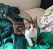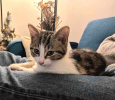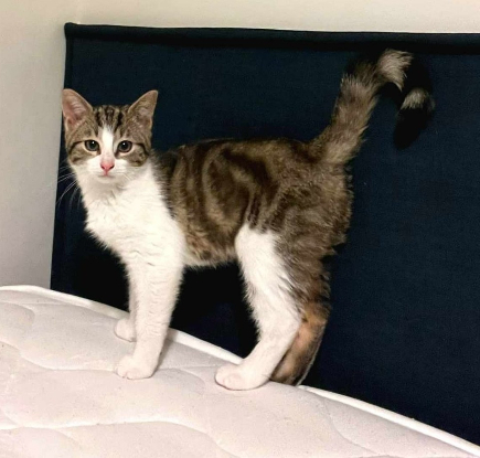 Femelle tigrée et blanche avec une tache rousse et son trait d’eyeliner. Elle est la plus acrobate (voire contorsionniste) de la portée. Très joueuse, elle est aussi câline. Elle est également très curieuse. Sa spécialité : les cabrioles et faire des siestes dans des endroits impromptus (tiroir de salle de bain par exemple). Propre