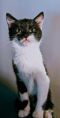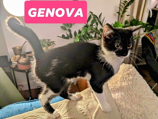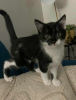 Femelle noire et blanche avec son masque de catwoman. Elle est très câline mais également joueuse. C'est pour le moment la plus petite et la plus calme de la portée. Sa spécialité : les très (très) longues siestes. Propre