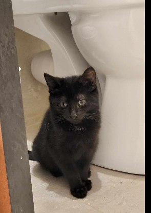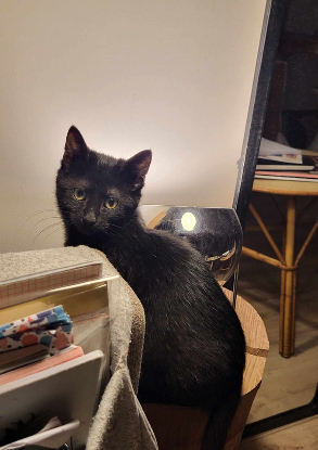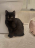 Petit chaton noir, encore craintif mais qui n'en reste pas moins trés curieux. Il commence à se laisser amadouer par le jeu, notamment celui de la canne à pêche. Il aime aussi courrir aprés ses fréres. Il est le plus gourmand de sa fraterie, et raffole de la paté. Il accepte même de manger dans la main de l'humain. Il est propre. Il lui faudra une famille douce et patiente pour qu'il prenne confiance en son humain.