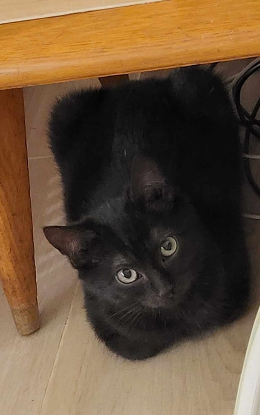 Chaton noir, petit modéle copie conforme de son frére Marly. Il est le plus craintif de la fraterie et préfére attendre d'être au calme pour sortir déguster son repas. Il aime dormir blotti contre l'un de ses fréres. Il recherche les endroits à l'abri mais ose quelques sorties lorsque l'un de ses congénéres est à ses cotés. Il est propre. ll lui faudra beaucoup d'amour et de tendresse dans son nouveau foyer pour la vie.