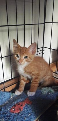 Chaton mâle 2 mois roux et blanc en cours de socia trouvé dans un jardin