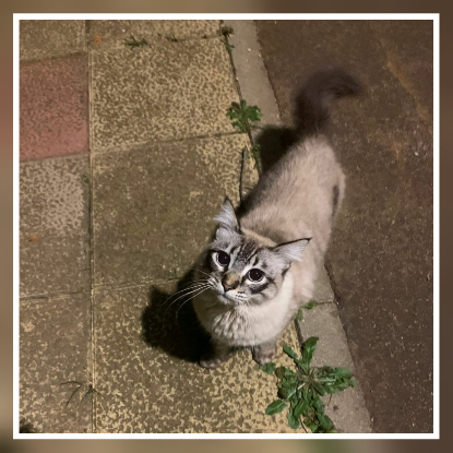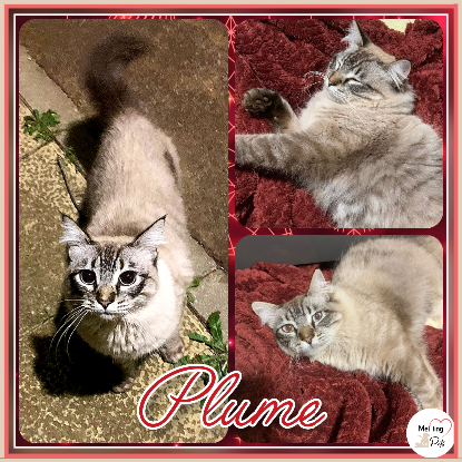 Plume a été trouvée dans la rue alors qu'elle réclamait de l'attention à tous les passants qu'elle croisait en miaulant, réclamant des caresses et pour être prise dans les bras.