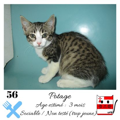 URGENCE EUTHANASIE ! Potage est un mâle de 3 mois sociable qui vous attend dans une fourrière du 56. ATTENTION SORTIE AU PLUS TARD LE 14/08/2020 (avant euthanasie) ! Pour adopter, c'est facile : ➡️ On se rend sur la page facebook d'Urgence Fourrière de Bretagne (UFB) -> https://www.facebook.com/sosfourrieresbreizh/ ➡️ On vient en message privé sur la page UFB ➡️ On remplit le questionnaire ➡️ Si le questionnaire est validé, on se rend disponible pour la pré-visite ➡️ On se rend aussi disponible pour venir chercher le loulou en fourrière Les chats sortent de fourrière primo-vaccinés et identifiés. Restera à charge de l’adoptant le rappel de vaccin et la stérilisation qui est OBLIGATOIRE. Les femelles en fourrière ayant été trouvées dans la rue, il y a fort à parier que nombre d'entre elles en âge de l'être soient gestantes ... ---- A PROPOS D'URGENCE FOURRIERE DE BRETAGNE (UFB) Nous sommes un COLLECTIF d'ASSOCIATIONS DE PROTECTION ANIMALE (qui rassemble notamment Moustaches et Compagnie, Bêtes de Scène, les Pachas, Chats Libres de Berné, etc, etc....) Le BUT de ce collectif d'associations est donc de SORTIR ces animaux des fourrières surchargées en les faisant ADOPTER de manière LEGALE par des familles ou en leur trouvant des FAMILLES D'ACCUEIL lorsque des places en association se libèrent.