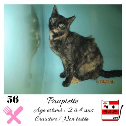URGENCE EUTHANASIE ! Paupiette est une femelle de 2-4 ans craintive (un comportement normal en fourrière) qui vous attend dans une fourrière du 56. ATTENTION SORTIE AU PLUS TARD LE 14/08/2020 (avant euthanasie) ! Pour adopter, c'est facile : ➡️ On se rend sur la page facebook d'Urgence Fourrière de Bretagne (UFB) -> https://www.facebook.com/sosfourrieresbreizh/ ➡️ On vient en message privé sur la page UFB ➡️ On remplit le questionnaire ➡️ Si le questionnaire est validé, on se rend disponible pour la pré-visite ➡️ On se rend aussi disponible pour venir chercher le loulou en fourrière Les chats sortent de fourrière primo-vaccinés et identifiés. Restera à charge de l’adoptant le rappel de vaccin et la stérilisation qui est OBLIGATOIRE. Les femelles en fourrière ayant été trouvées dans la rue, il y a fort à parier que nombre d'entre elles en âge de l'être soient gestantes ... ---- A PROPOS D'URGENCE FOURRIERE DE BRETAGNE (UFB) Nous sommes un COLLECTIF d'ASSOCIATIONS DE PROTECTION ANIMALE (qui rassemble notamment Moustaches et Compagnie, Bêtes de Scène, les Pachas, Chats Libres de Berné, etc, etc....) Le BUT de ce collectif d'associations est donc de SORTIR ces animaux des fourrières surchargées en les faisant ADOPTER de manière LEGALE par des familles ou en leur trouvant des FAMILLES D'ACCUEIL lorsque des places en association se libèrent.