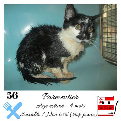 URGENCE EUTHANASIE ! Parmentier est un mâle de 4 mois sociable qui vous attend dans une fourrière du 56. ATTENTION SORTIE AU PLUS TARD LE 14/08/2020 (avant euthanasie) ! Pour adopter, c'est facile : ➡️ On se rend sur la page facebook d'Urgence Fourrière de Bretagne (UFB) -> https://www.facebook.com/sosfourrieresbreizh/ ➡️ On vient en message privé sur la page UFB ➡️ On remplit le questionnaire ➡️ Si le questionnaire est validé, on se rend disponible pour la pré-visite ➡️ On se rend aussi disponible pour venir chercher le loulou en fourrière Les chats sortent de fourrière primo-vaccinés et identifiés. Restera à charge de l’adoptant le rappel de vaccin et la stérilisation qui est OBLIGATOIRE. Les femelles en fourrière ayant été trouvées dans la rue, il y a fort à parier que nombre d'entre elles en âge de l'être soient gestantes ... ---- A PROPOS D'URGENCE FOURRIERE DE BRETAGNE (UFB) Nous sommes un COLLECTIF d'ASSOCIATIONS DE PROTECTION ANIMALE (qui rassemble notamment Moustaches et Compagnie, Bêtes de Scène, les Pachas, Chats Libres de Berné, etc, etc....) Le BUT de ce collectif d'associations est donc de SORTIR ces animaux des fourrières surchargées en les faisant ADOPTER de manière LEGALE par des familles ou en leur trouvant des FAMILLES D'ACCUEIL lorsque des places en association se libèrent.