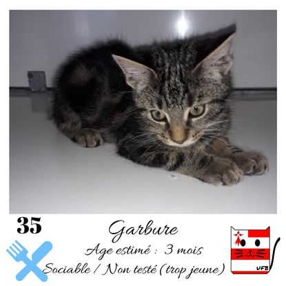 URGENCE EUTHANASIE ! Garbure est un mâle de 3 mois sociable qui vous attend dans une fourrière du 35. ATTENTION SORTIE AU PLUS TARD LE 14/08/2020 (avant euthanasie) ! Pour adopter, c'est facile : ➡️ On se rend sur la page facebook d'Urgence Fourrière de Bretagne (UFB) -> https://www.facebook.com/sosfourrieresbreizh/ ➡️ On vient en message privé sur la page UFB ➡️ On remplit le questionnaire ➡️ Si le questionnaire est validé, on se rend disponible pour la pré-visite ➡️ On se rend aussi disponible pour venir chercher le loulou en fourrière Les chats sortent de fourrière primo-vaccinés et identifiés. Restera à charge de l’adoptant le rappel de vaccin et la stérilisation qui est OBLIGATOIRE. Les femelles en fourrière ayant été trouvées dans la rue, il y a fort à parier que nombre d'entre elles en âge de l'être soient gestantes ... ---- A PROPOS D'URGENCE FOURRIERE DE BRETAGNE (UFB) Nous sommes un COLLECTIF d'ASSOCIATIONS DE PROTECTION ANIMALE (qui rassemble notamment Moustaches et Compagnie, Bêtes de Scène, les Pachas, Chats Libres de Berné, etc, etc....) Le BUT de ce collectif d'associations est donc de SORTIR ces animaux des fourrières surchargées en les faisant ADOPTER de manière LEGALE par des familles ou en leur trouvant des FAMILLES D'ACCUEIL lorsque des places en association se libèrent.