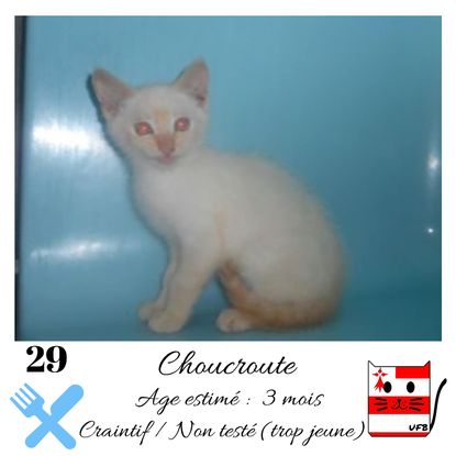 URGENCE EUTHANASIE ! Choucroute est un mâle de 3 mois craintif (un comportement normal en fourrière) qui vous attend dans une fourrière du 29. ATTENTION SORTIE AU PLUS TARD LE 14/08/2020 (avant euthanasie) ! Pour adopter, c'est facile : ➡️ On se rend sur la page facebook d'Urgence Fourrière de Bretagne (UFB) -> https://www.facebook.com/sosfourrieresbreizh/ ➡️ On vient en message privé sur la page UFB ➡️ On remplit le questionnaire ➡️ Si le questionnaire est validé, on se rend disponible pour la pré-visite ➡️ On se rend aussi disponible pour venir chercher le loulou en fourrière Les chats sortent de fourrière primo-vaccinés et identifiés. Restera à charge de l’adoptant le rappel de vaccin et la stérilisation qui est OBLIGATOIRE. Les femelles en fourrière ayant été trouvées dans la rue, il y a fort à parier que nombre d'entre elles en âge de l'être soient gestantes ... ---- A PROPOS D'URGENCE FOURRIERE DE BRETAGNE (UFB) Nous sommes un COLLECTIF d'ASSOCIATIONS DE PROTECTION ANIMALE (qui rassemble notamment Moustaches et Compagnie, Bêtes de Scène, les Pachas, Chats Libres de Berné, etc, etc....) Le BUT de ce collectif d'associations est donc de SORTIR ces animaux des fourrières surchargées en les faisant ADOPTER de manière LEGALE par des familles ou en leur trouvant des FAMILLES D'ACCUEIL lorsque des places en association se libèrent.