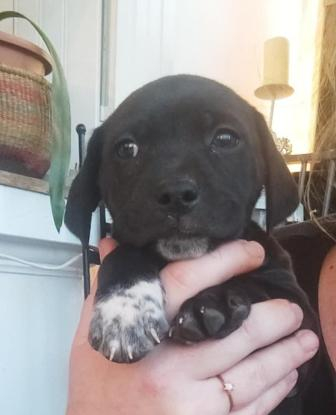 Petite femelle d’un mois et demi, X staffie/epagneul.