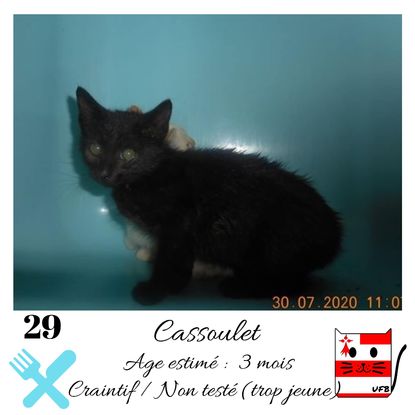 URGENCE EUTHANASIE ! Cassoulet est un mâle de 3 mois craintif (un comportement normal en fourrière) qui vous attend dans une fourrière du 29. ATTENTION SORTIE AU PLUS TARD LE 14/08/2020 (avant euthanasie) ! Pour adopter, c'est facile : ➡️ On se rend sur la page facebook d'Urgence Fourrière de Bretagne (UFB) -> https://www.facebook.com/sosfourrieresbreizh/ ➡️ On vient en message privé sur la page UFB ➡️ On remplit le questionnaire ➡️ Si le questionnaire est validé, on se rend disponible pour la pré-visite ➡️ On se rend aussi disponible pour venir chercher le loulou en fourrière Les chats sortent de fourrière primo-vaccinés et identifiés. Restera à charge de l’adoptant le rappel de vaccin et la stérilisation qui est OBLIGATOIRE. Les femelles en fourrière ayant été trouvées dans la rue, il y a fort à parier que nombre d'entre elles en âge de l'être soient gestantes ... ---- A PROPOS D'URGENCE FOURRIERE DE BRETAGNE (UFB) Nous sommes un COLLECTIF d'ASSOCIATIONS DE PROTECTION ANIMALE (qui rassemble notamment Moustaches et Compagnie, Bêtes de Scène, les Pachas, Chats Libres de Berné, etc, etc....) Le BUT de ce collectif d'associations est donc de SORTIR ces animaux des fourrières surchargées en les faisant ADOPTER de manière LEGALE par des familles ou en leur trouvant des FAMILLES D'ACCUEIL lorsque des places en association se libèrent.