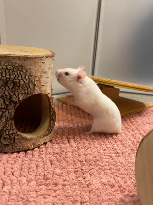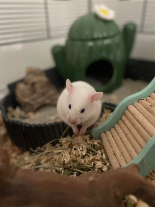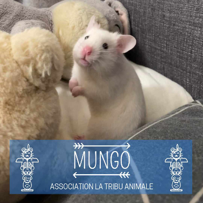 Mungo est une charmante petite syrienne qui adore sa roue, creuser de magnifique tunnels et se rouler dans le sable. Douce, curieuse et gourmande elle se laisse bien manipuler, petites caresses dans son habitat et manipulation plus poussée en sortie dans le parc.