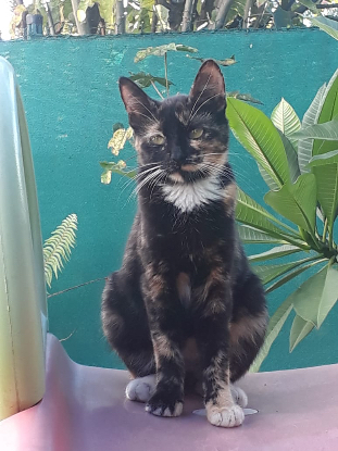 Son histoire  : "Un matin, Oudini s'est invitée dans notre jardin, maigre et assoiffée, faisant de nous son nouveau foyer : 2 humains pour me dorloter, une copine avec qui jouer, et bien sûr à boire et à manger." Maintenant qu'elle s'est refait une santé, elle est prête à rejoindre sa nouvelle famille.