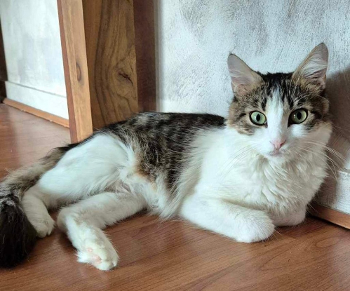 J’ai été trouvée gestante sur le point de mettre bas, dans la rue, par chance en bonne santé. Je fais étonnement confiance aux humains, n’ai jamais eu peur d’eux et j’ai pu mettre bas cinq petits bien au chaud. Je suis câline, même si depuis que je suis maman j’aime mes moments de tranquillité.