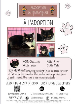 Chaussette est un chat mâle noir et blanc de 4 ans qui a été trouvé errant dans une cave du 93. On ne sait pas ce qu’il a vécu, mais il a eu besoin de beaucoup de temps pour faire confiance à l’humain…