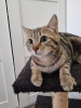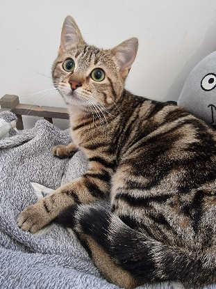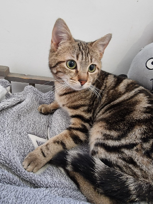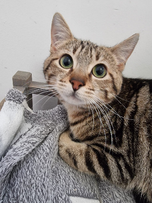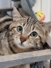 La puce reste une chatte craintive, pas méchante mais elle se méfie encore des humains et devra avoir une famille habituée aux chats pour poursuivre sa socialisation.