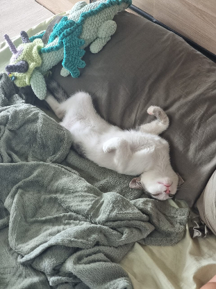Son caractère : Mini crotte est très câline, elle adore grimper partout en mode escalade(pas sauter) et elle aime l'eau étonnamment : En y allant doucement pour ne pas qu'elle prenne peur mais elle court dans l'eau quand on se douche. Très vite à l'aise dans ses pattounes, elle a exploré la maison un peu plus chaque jour. Comme tout chaton elle passe beaucoup de temps à jouer et à dormir.