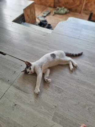 Son histoire : Elle a débarqué un soir en miaulant sur le pas de la porte de ses sauveurs. Apeuré mais avec l'envie de trouver refuge, elle s'est laissé attrapé le lendemain et a pu être sécurisée. Malgré la peur de l'inconnu elle cherchait déjà les câlins .