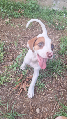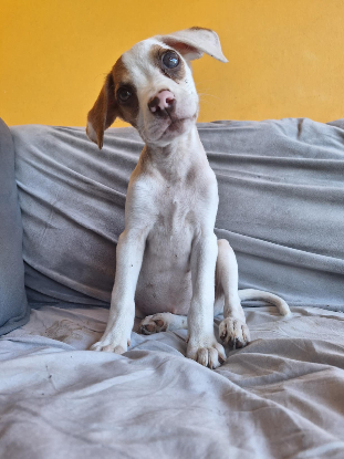Recueillie et soignée, cette adorable chiot n'a pas perdue son envie de vivre ni son incroyable douceur. Son œil gauche a subit une lésion ce qui la rend aveugle de cet œil, mais elle voit toujours très bien grâce à son œil droit.
