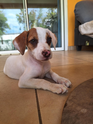Croisée braque née le 01/01/25, Mia devrait devenir une chienne de 15 à 20 kg à l’âge adulte.