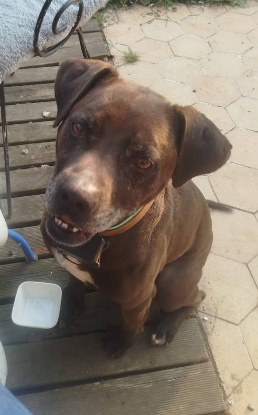 SOCRATE, mâle croisé dogue, staff et berger malinois à l'adoption avec l'association Cybèle-Les fées de l'espoir.