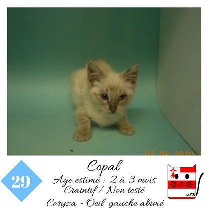 URGENCE EUTHANASIE ! Copal est un mâle de 2-3 mois craintif (un comportement normal en fourrière) qui vous attend dans une fourrière du 29. ATTENTION SORTIE AU PLUS TARD LE 21/08/2020 (avant euthanasie) ! Pour adopter, c'est facile : ➡️ On se rend sur la page facebook d'Urgence Fourrière de Bretagne (UFB) -> https://www.facebook.com/sosfourrieresbreizh/ ➡️ On vient en message privé sur la page UFB ➡️ On remplit le questionnaire ➡️ Si le questionnaire est validé, on se rend disponible pour la pré-visite ➡️ On se rend aussi disponible pour venir chercher le loulou en fourrière Les chats sortent de fourrière primo-vaccinés et identifiés. Restera à charge de l’adoptant le rappel de vaccin et la stérilisation qui est OBLIGATOIRE. Les femelles en fourrière ayant été trouvées dans la rue, il y a fort à parier que nombre d'entre elles en âge de l'être soient gestantes ... ---- A PROPOS D'URGENCE FOURRIERE DE BRETAGNE (UFB) Nous sommes un COLLECTIF d'ASSOCIATIONS DE PROTECTION ANIMALE (qui rassemble notamment Moustaches et Compagnie, Bêtes de Scène, les Pachas, Chats Libres de Berné, etc, etc....) Le BUT de ce collectif d'associations est donc de SORTIR ces animaux des fourrières surchargées en les faisant ADOPTER de manière LEGALE par des familles ou en leur trouvant des FAMILLES D'ACCUEIL lorsque des places en association se libèrent.