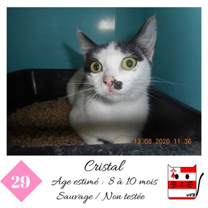 URGENCE EUTHANASIE ! Cristal est une femelle de 8-10 mois sauvageonne (un comportement normal en fourrière) qui vous attend dans une fourrière du 29. ATTENTION SORTIE AU PLUS TARD LE 21/08/2020 (avant euthanasie) ! Pour adopter, c'est facile : ➡️ On se rend sur la page facebook d'Urgence Fourrière de Bretagne (UFB) -> https://www.facebook.com/sosfourrieresbreizh/ ➡️ On vient en message privé sur la page UFB ➡️ On remplit le questionnaire ➡️ Si le questionnaire est validé, on se rend disponible pour la pré-visite ➡️ On se rend aussi disponible pour venir chercher le loulou en fourrière Les chats sortent de fourrière primo-vaccinés et identifiés. Restera à charge de l’adoptant le rappel de vaccin et la stérilisation qui est OBLIGATOIRE. Les femelles en fourrière ayant été trouvées dans la rue, il y a fort à parier que nombre d'entre elles en âge de l'être soient gestantes ... ---- A PROPOS D'URGENCE FOURRIERE DE BRETAGNE (UFB) Nous sommes un COLLECTIF d'ASSOCIATIONS DE PROTECTION ANIMALE (qui rassemble notamment Moustaches et Compagnie, Bêtes de Scène, les Pachas, Chats Libres de Berné, etc, etc....) Le BUT de ce collectif d'associations est donc de SORTIR ces animaux des fourrières surchargées en les faisant ADOPTER de manière LEGALE par des familles ou en leur trouvant des FAMILLES D'ACCUEIL lorsque des places en association se libèrent.