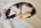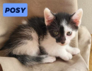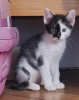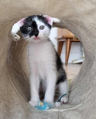 Petit chaton noir et blanc, seul mâle de sa fratrie et meilleur chasseur de la bande. Un peu craintif des gestes brusques, il aimera néanmoins faire de longue sieste sur vos genoux, bien au chaud. C'est un grand joueur, toujours le premier à apparaître lorsque qu'il entend le grelot du jeu de la canne à pêche. Il aime aussi beaucoup jouer à la bagarre avec ses sœurs. Il est propre. Il lui faudra une famille douce et cherchant à stimuler son instinct de chasseur par le jeu.