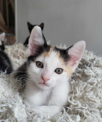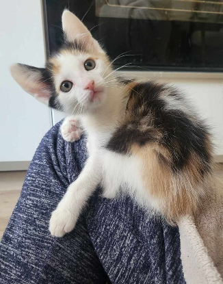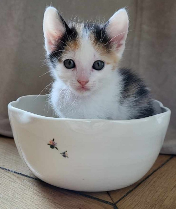 Petite chatonne tricolore. Trés jolie, elle vous fera fondre avec ses attitudes et ses poses à tomber. C'est une grande joueuse et une bonne chasseuse comme son frère Posy. Elle apprécie la compagnie de son humain et aime dormir contre lui ou sur ses genoux. Passion etonnante, elle adore se jeter sur le balai tout comme sa sœur Saro. Elle est propre et apprécie d'ailleurs faire la toilette à son humain. Adorable et jolie comme un cœur, elle fera le bonheur de sa future famille.