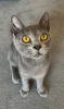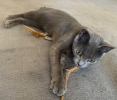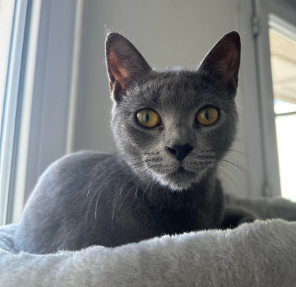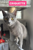 Criquette est une jeune chatte d’environ un an, toute grise aux grands yeux jaunes.