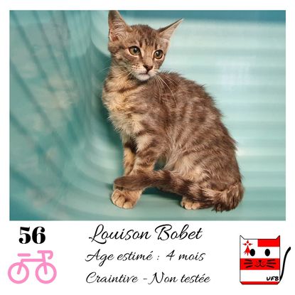 URGENCE EUTHANASIE ! Louison Bobet est une femelle de 4 mois craintive (un comportement normal en fourrière) qui vous attend dans une fourrière du 56. ATTENTION SORTIE AU PLUS TARD LE 28/08/2020 (avant euthanasie) ! Pour adopter, c'est facile : ➡️ On se rend sur la page facebook d'Urgence Fourrière de Bretagne (UFB) -> https://www.facebook.com/sosfourrieresbreizh/ ➡️ On vient en message privé sur la page UFB ➡️ On remplit le questionnaire ➡️ Si le questionnaire est validé, on se rend disponible pour la pré-visite ➡️ On se rend aussi disponible pour venir chercher le loulou en fourrière Les chats sortent de fourrière primo-vaccinés et identifiés. Restera à charge de l’adoptant le rappel de vaccin et la stérilisation qui est OBLIGATOIRE. Les femelles en fourrière ayant été trouvées dans la rue, il y a fort à parier que nombre d'entre elles en âge de l'être soient gestantes ... ---- A PROPOS D'URGENCE FOURRIERE DE BRETAGNE (UFB) Nous sommes un COLLECTIF d'ASSOCIATIONS DE PROTECTION ANIMALE (qui rassemble notamment Moustaches et Compagnie, Bêtes de Scène, les Pachas, Chats Libres de Berné, etc, etc....) Le BUT de ce collectif d'associations est donc de SORTIR ces animaux des fourrières surchargées en les faisant ADOPTER de manière LEGALE par des familles ou en leur trouvant des FAMILLES D'ACCUEIL lorsque des places en association se libèrent.