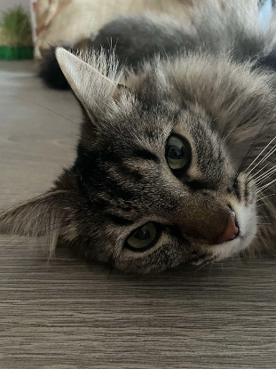 Ce splendide tigré au look de norvégien a tout d’un petit prince: de grands yeux expressifs, une passion pour les séances de brossage (même pendant ses repas !) et un vrai sens de la présence: il répond même quand on lui parle.
