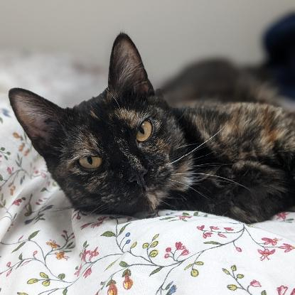 Je suis une superbe minette écaille de tortue. J'ai le poil tout doux et une queue touffue! Je suis vraiment très belle.