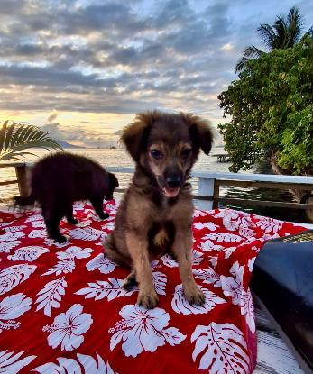 Shipa est une petite chienne issue d’une portée sauvage, une situation malheureusement fréquente en Polynésie. Elle a failli connaître une fin tragique : une bénévole a surpris une personne s’apprêtant à jeter Tiva et sa sœur, enfermées dans un sac plastique, dans une rivière.