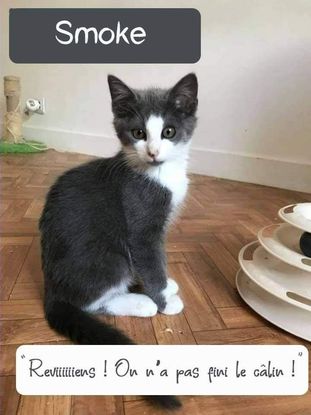 Bonjour, moi c'est Smoke ! Ma première passion, c'est les câlins, c'est simple, dès que je vois des humains, je fonce sur eux pour les câliner, quitte à leur monter dessus carrément ! Ma deuxième passion, c'est le jeux, courir après une balle, monter sur des jeux ou encore jouer avec mes frères et sœurs, ça je sais faire ! Ma troisième et dernière passion c'est de me reposer sur les humains, je vous explique comment je procède : 1) Je leur fait un câlin et une fois amadouer, 2) Je m'allonge sur leur genoux, 3) J'étire mes deux pattes avant et je mets ma tête entre. Je vous laisse imaginer, la position qui fait de moi, le chat le plus mignon au monde, si si je vous assure ! Venez le voir de vous même si vous ne me croyez pas, à La Dominelais dans le 35. Formulaire de Pré Adoption : https://docs.google.com/forms/d/e/1FAIpQLSeO_7R3eIOTNdox-jdtJHhUttJ9VH_I3yX7LM086y9NS6fYtw/viewform?usp=sf_link