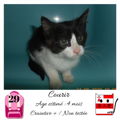 URGENCE EUTHANASIE ! Courir est une femelle de 4 mois craintive (un comportement normal en fourrière) qui vous attend dans une fourrière du 29. ATTENTION SORTIE AU PLUS TARD LE 04/09/2020 (avant euthanasie) ! Pour adopter, c'est facile : ➡️ On se rend sur la page facebook d'Urgence Fourrière de Bretagne (UFB) -> https://www.facebook.com/sosfourrieresbreizh/ ➡️ On vient en message privé sur la page UFB ➡️ On remplit le questionnaire ➡️ Si le questionnaire est validé, on se rend disponible pour la pré-visite ➡️ On se rend aussi disponible pour venir chercher le loulou en fourrière Les chats sortent de fourrière primo-vaccinés et identifiés. Restera à charge de l’adoptant le rappel de vaccin et la stérilisation qui est OBLIGATOIRE. Les femelles en fourrière ayant été trouvées dans la rue, il y a fort à parier que nombre d'entre elles en âge de l'être soient gestantes ... ---- A PROPOS D'URGENCE FOURRIERE DE BRETAGNE (UFB) Nous sommes un COLLECTIF d'ASSOCIATIONS DE PROTECTION ANIMALE (qui rassemble notamment Moustaches et Compagnie, Bêtes de Scène, les Pachas, Chats Libres de Berné, etc, etc....) Le BUT de ce collectif d'associations est donc de SORTIR ces animaux des fourrières surchargées en les faisant ADOPTER de manière LEGALE par des familles ou en leur trouvant des FAMILLES D'ACCUEIL lorsque des places en association se libèrent.