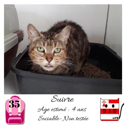URGENCE EUTHANASIE ! Suivre est une femelle de 4 ans sociable qui vous attend dans une fourrière du 35. ATTENTION SORTIE AU PLUS TARD LE 04/09/2020 (avant euthanasie) ! Pour adopter, c'est facile : ➡️ On se rend sur la page facebook d'Urgence Fourrière de Bretagne (UFB) -> https://www.facebook.com/sosfourrieresbreizh/ ➡️ On vient en message privé sur la page UFB ➡️ On remplit le questionnaire ➡️ Si le questionnaire est validé, on se rend disponible pour la pré-visite ➡️ On se rend aussi disponible pour venir chercher le loulou en fourrière Les chats sortent de fourrière primo-vaccinés et identifiés. Restera à charge de l’adoptant le rappel de vaccin et la stérilisation qui est OBLIGATOIRE. Les femelles en fourrière ayant été trouvées dans la rue, il y a fort à parier que nombre d'entre elles en âge de l'être soient gestantes ... ---- A PROPOS D'URGENCE FOURRIERE DE BRETAGNE (UFB) Nous sommes un COLLECTIF d'ASSOCIATIONS DE PROTECTION ANIMALE (qui rassemble notamment Moustaches et Compagnie, Bêtes de Scène, les Pachas, Chats Libres de Berné, etc, etc....) Le BUT de ce collectif d'associations est donc de SORTIR ces animaux des fourrières surchargées en les faisant ADOPTER de manière LEGALE par des familles ou en leur trouvant des FAMILLES D'ACCUEIL lorsque des places en association se libèrent.