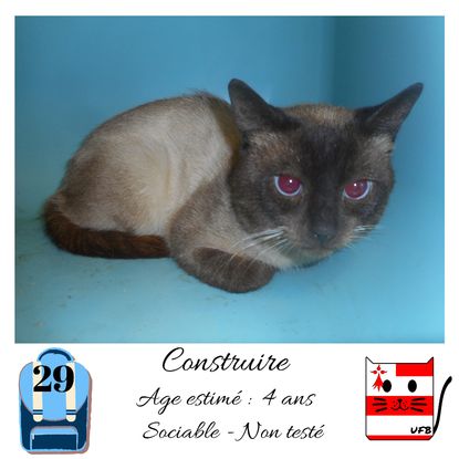 URGENCE EUTHANASIE ! Construire est un mâle de 4 ans sociable qui vous attend dans une fourrière du 29. ATTENTION SORTIE AU PLUS TARD LE 04/09/2020 (avant euthanasie) ! Pour adopter, c'est facile : ➡️ On se rend sur la page facebook d'Urgence Fourrière de Bretagne (UFB) -> https://www.facebook.com/sosfourrieresbreizh/ ➡️ On vient en message privé sur la page UFB ➡️ On remplit le questionnaire ➡️ Si le questionnaire est validé, on se rend disponible pour la pré-visite ➡️ On se rend aussi disponible pour venir chercher le loulou en fourrière Les chats sortent de fourrière primo-vaccinés et identifiés. Restera à charge de l’adoptant le rappel de vaccin et la stérilisation qui est OBLIGATOIRE. Les femelles en fourrière ayant été trouvées dans la rue, il y a fort à parier que nombre d'entre elles en âge de l'être soient gestantes ... ---- A PROPOS D'URGENCE FOURRIERE DE BRETAGNE (UFB) Nous sommes un COLLECTIF d'ASSOCIATIONS DE PROTECTION ANIMALE (qui rassemble notamment Moustaches et Compagnie, Bêtes de Scène, les Pachas, Chats Libres de Berné, etc, etc....) Le BUT de ce collectif d'associations est donc de SORTIR ces animaux des fourrières surchargées en les faisant ADOPTER de manière LEGALE par des familles ou en leur trouvant des FAMILLES D'ACCUEIL lorsque des places en association se libèrent.