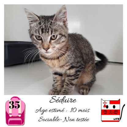 URGENCE EUTHANASIE ! Séduire est une femelle de 10 mois sociable qui vous attend dans une fourrière du 35. ATTENTION SORTIE AU PLUS TARD LE 04/09/2020 (avant euthanasie) ! Pour adopter, c'est facile : ➡️ On se rend sur la page facebook d'Urgence Fourrière de Bretagne (UFB) -> https://www.facebook.com/sosfourrieresbreizh/ ➡️ On vient en message privé sur la page UFB ➡️ On remplit le questionnaire ➡️ Si le questionnaire est validé, on se rend disponible pour la pré-visite ➡️ On se rend aussi disponible pour venir chercher le loulou en fourrière Les chats sortent de fourrière primo-vaccinés et identifiés. Restera à charge de l’adoptant le rappel de vaccin et la stérilisation qui est OBLIGATOIRE. Les femelles en fourrière ayant été trouvées dans la rue, il y a fort à parier que nombre d'entre elles en âge de l'être soient gestantes ... ---- A PROPOS D'URGENCE FOURRIERE DE BRETAGNE (UFB) Nous sommes un COLLECTIF d'ASSOCIATIONS DE PROTECTION ANIMALE (qui rassemble notamment Moustaches et Compagnie, Bêtes de Scène, les Pachas, Chats Libres de Berné, etc, etc....) Le BUT de ce collectif d'associations est donc de SORTIR ces animaux des fourrières surchargées en les faisant ADOPTER de manière LEGALE par des familles ou en leur trouvant des FAMILLES D'ACCUEIL lorsque des places en association se libèrent.